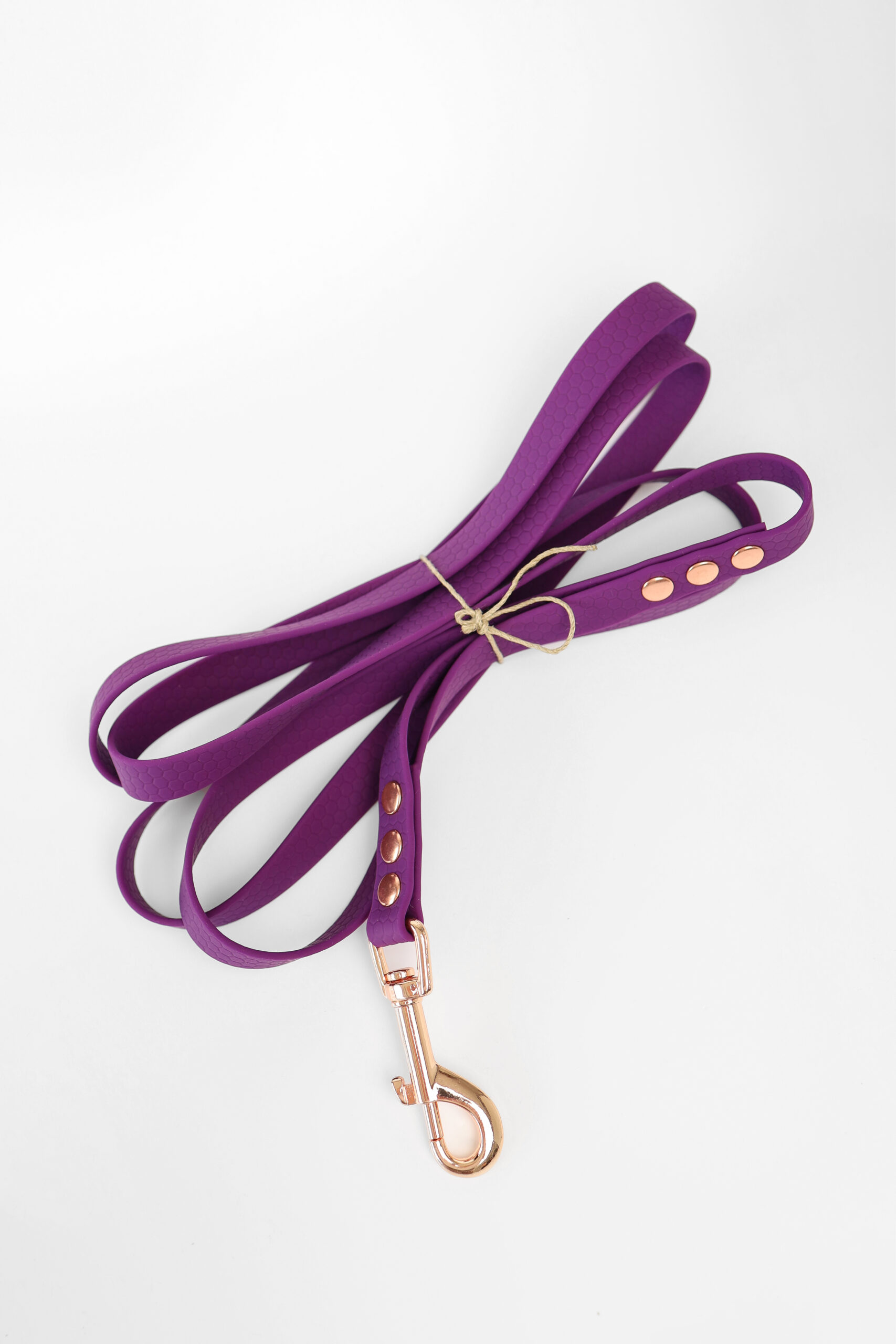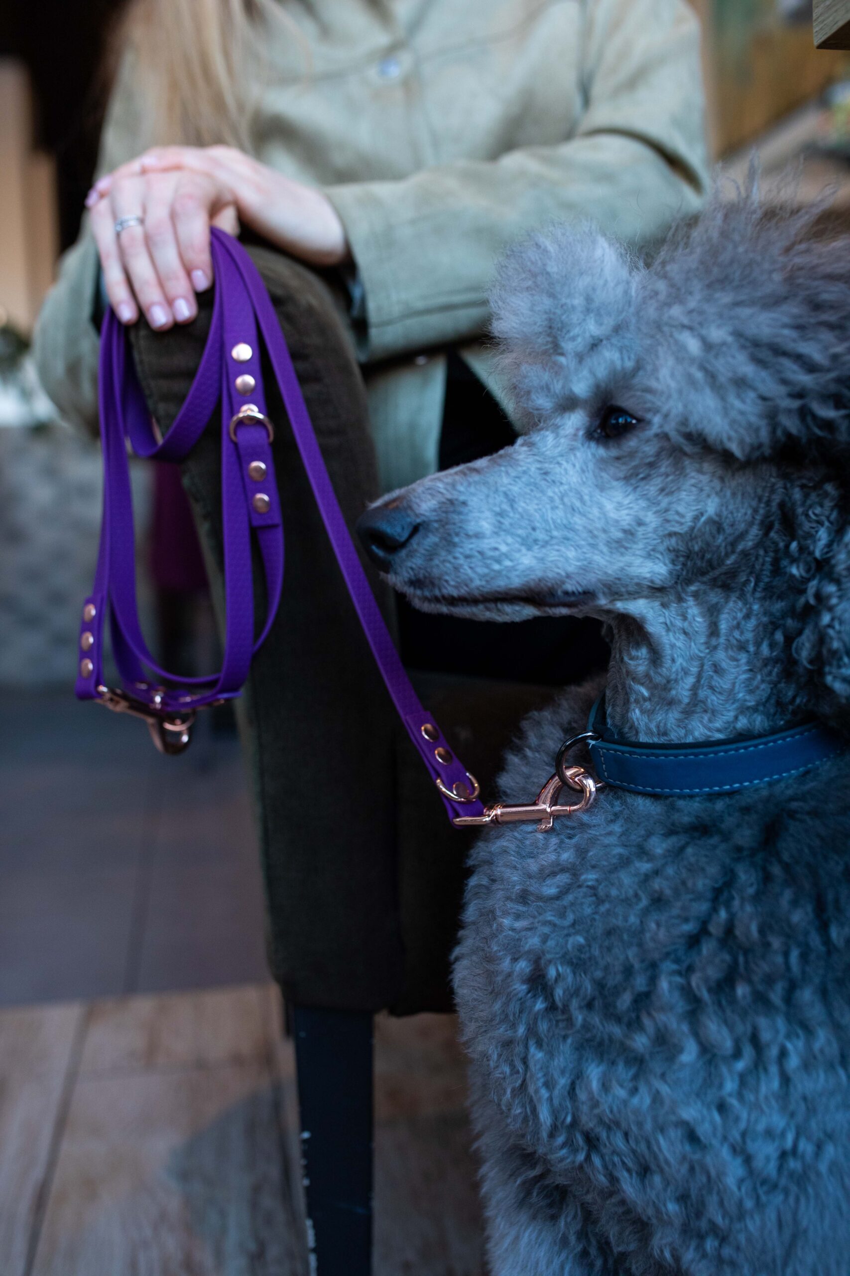 Długość smyczy to 200 cm, co zapewnia swobodę ruchów podczas spaceru. Szerokość 1,6 cm oraz miękka, wygodna rączka sprawiają, że smycz dobrze leży w dłoni i jest komfortowa w użytkowaniu. Pastelowy odcień fioletu w połączeniu ze złotymi okuciami nadaje jej elegancki wygląd.