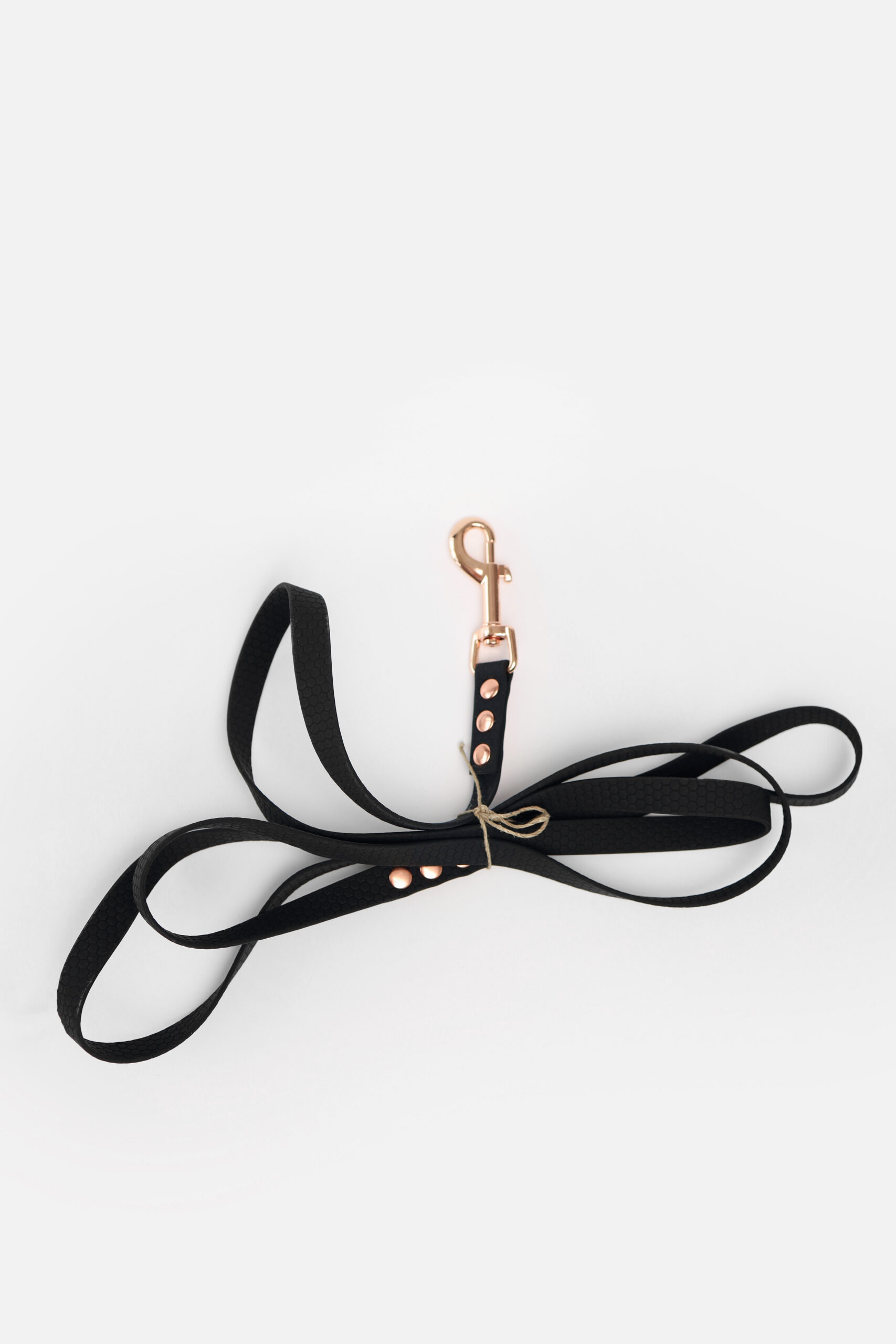 Długość smyczy to 200 cm, co zapewnia swobodę ruchów podczas spaceru. Szerokość 1,6 cm oraz miękka, wygodna rączka sprawiają, że smycz dobrze leży w dłoni i jest komfortowa w użytkowaniu. Delikatny, pastelowy odcień czerni w połączeniu ze złotymi okuciami nadaje jej elegancki wygląd.